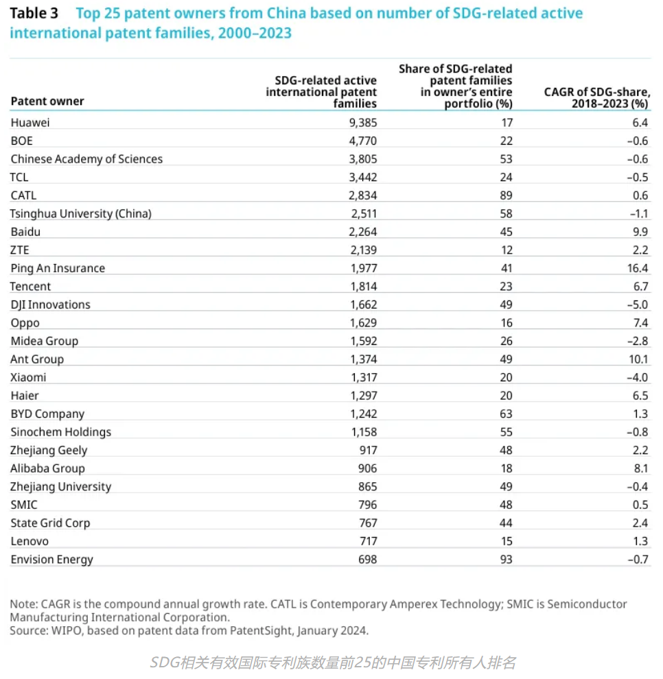 SDG相關專利申請活動在世界各地均有增加,不過中國近年來的專利申請量呈指數級增長。在中國申請人排名中,以華為為首,其次是BOE、中國科學院和TCL。