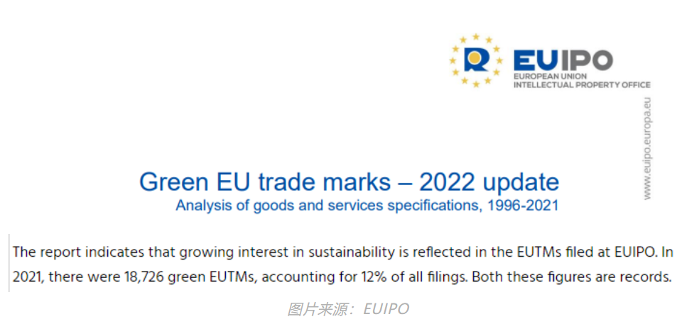 2021年,歐盟知識產(chǎn)權(quán)局(EUIPO)通過歐洲知識產(chǎn)權(quán)侵權(quán)觀察站進(jìn)行了一項關(guān)于綠色歐盟商標(biāo)的研究,旨在研究公眾和政策制定者對氣候變化和環(huán)境惡化的日益關(guān)注是否反映在歐盟商標(biāo)申請中。2023年2月發(fā)布的《綠色歐盟商標(biāo)——2022年更新(Green EU trade marks-2022 update)》顯示2021年在EUIPO申請的綠色歐盟商標(biāo)數(shù)量創(chuàng)下了歷史新高。